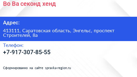 Во!Ва!, секонд-хенд по адресу 413111, Саратовская область, Энгельс, проспект Строителей, 8а в дальнейшем Организация, размещена в следующих категориях: