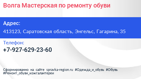 Волга, Мастерская по ремонту обуви по адресу 413123, Саратовская область, Энгельс, Гагарина, 35 в дальнейшем Организация, размещена в следующих категориях: