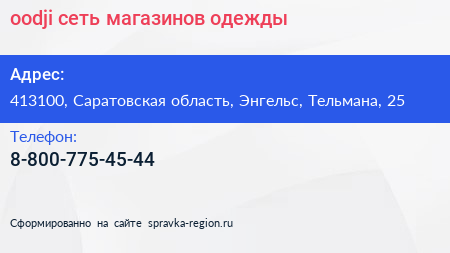 oodji, сеть магазинов одежды по адресу 413100, Саратовская область, Энгельс, Тельмана, 25 в дальнейшем Организация, размещена в следующих категориях: