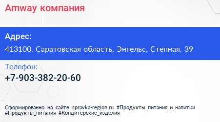 Amway, компания по адресу 413100, Саратовская область, Энгельс, Степная, 39 в дальнейшем Организация, размещена в следующих категориях: