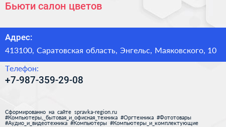 Бьюти, салон цветов по адресу 413100, Саратовская область, Энгельс, Маяковского, 10 в дальнейшем Организация, размещена в следующих категориях: