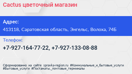 Cactus, цветочный магазин по адресу 413118, Саратовская область, Энгельс, Волоха, 74Б в дальнейшем Организация, размещена в следующих категориях: