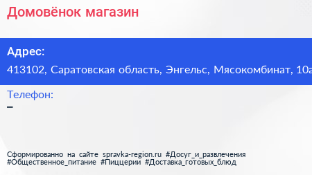 Домовёнок, магазин по адресу 413102, Саратовская область, Энгельс, Мясокомбинат, 10а в дальнейшем Организация, размещена в следующих категориях: