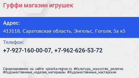 Гуффи, магазин игрушек по адресу 413118, Саратовская область, Энгельс, Гоголя, 5а к5 в дальнейшем Организация, размещена в следующих категориях: