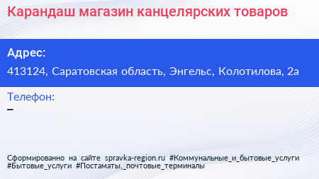 Карандаш, магазин канцелярских товаров по адресу 413124, Саратовская область, Энгельс, Колотилова, 2а в дальнейшем Организация, размещена в следующих категориях: