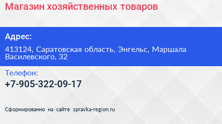 Магазин хозяйственных товаров по адресу 413124, Саратовская область, Энгельс, Маршала Василевского, 32 в дальнейшем Организация, размещена в следующих категориях: