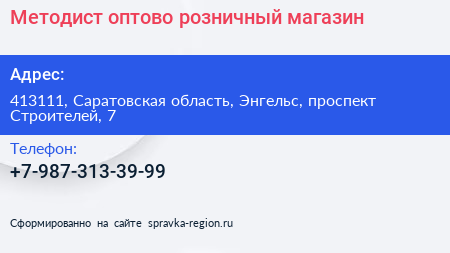 Методист, оптово-розничный магазин по адресу 413111, Саратовская область, Энгельс, проспект Строителей, 7 в дальнейшем Организация, размещена в следующих категориях: