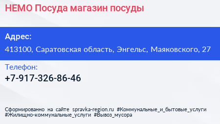 НЕМО-Посуда, магазин посуды по адресу 413100, Саратовская область, Энгельс, Маяковского, 27 в дальнейшем Организация, размещена в следующих категориях: