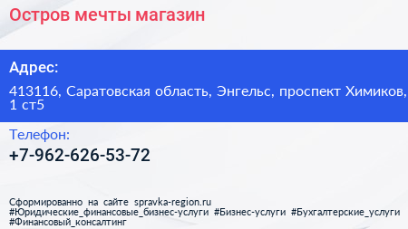 Остров мечты, магазин по адресу 413116, Саратовская область, Энгельс, проспект Химиков, 1 ст5 в дальнейшем Организация, размещена в следующих категориях: