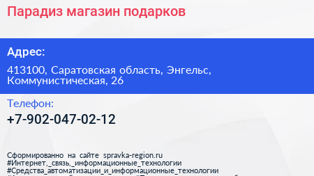 Парадиз, магазин подарков по адресу 413100, Саратовская область, Энгельс, Коммунистическая, 26 в дальнейшем Организация, размещена в следующих категориях: