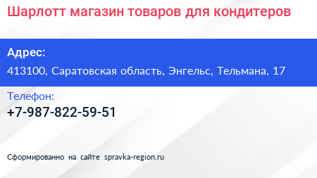 Шарлотт, магазин товаров для кондитеров по адресу 413100, Саратовская область, Энгельс, Тельмана, 17 в дальнейшем Организация, размещена в следующих категориях: