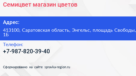 Семицвет, магазин цветов по адресу 413100, Саратовская область, Энгельс, площадь Свободы, 1Б в дальнейшем Организация, размещена в следующих категориях: