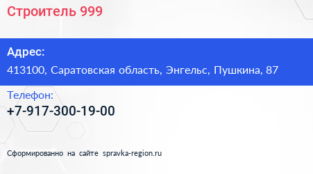Строитель 999 по адресу 413100, Саратовская область, Энгельс, Пушкина, 87 в дальнейшем Организация, размещена в следующих категориях: