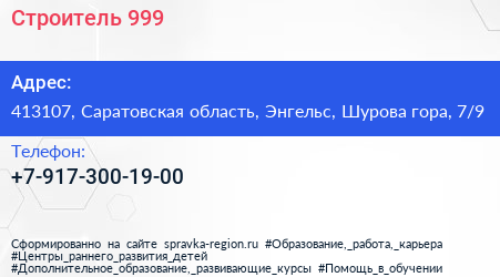 Строитель 999 по адресу 413107, Саратовская область, Энгельс, Шурова гора, 7/9 в дальнейшем Организация, размещена в следующих категориях:
