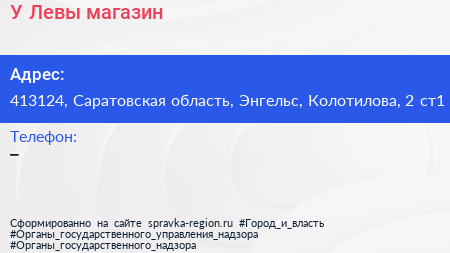 У Левы, магазин по адресу 413124, Саратовская область, Энгельс, Колотилова, 2 ст1 в дальнейшем Организация, размещена в следующих категориях:
