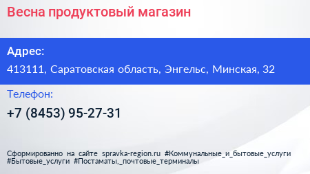 Весна, продуктовый магазин по адресу 413111, Саратовская область, Энгельс, Минская, 32 в дальнейшем Организация, размещена в следующих категориях: