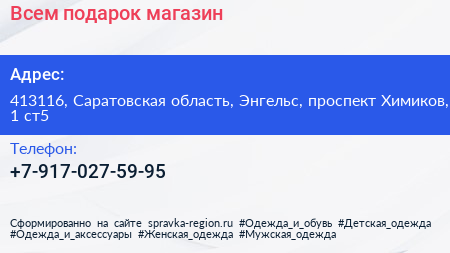 Всем подарок, магазин по адресу 413116, Саратовская область, Энгельс, проспект Химиков, 1 ст5 в дальнейшем Организация, размещена в следующих категориях: