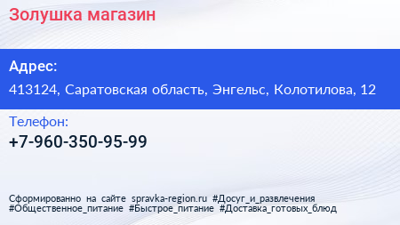 Золушка, магазин по адресу 413124, Саратовская область, Энгельс, Колотилова, 12 в дальнейшем Организация, размещена в следующих категориях: