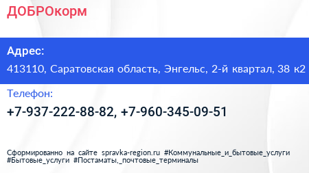 ДОБРОкорм по адресу 413110, Саратовская область, Энгельс, 2-й квартал, 38 к2 в дальнейшем Организация, размещена в следующих категориях: