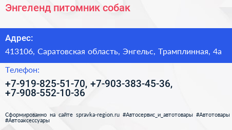 Энгеленд, питомник собак по адресу 413106, Саратовская область, Энгельс, Трамплинная, 4а в дальнейшем Организация, размещена в следующих категориях: