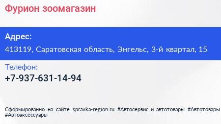 Фурион, зоомагазин по адресу 413119, Саратовская область, Энгельс, 3-й квартал, 15 в дальнейшем Организация, размещена в следующих категориях:
