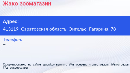Жако, зоомагазин по адресу 413119, Саратовская область, Энгельс, Гагарина, 78 в дальнейшем Организация, размещена в следующих категориях: