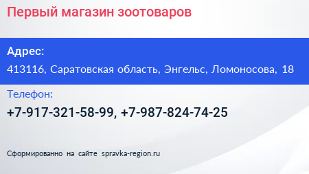 Первый, магазин зоотоваров по адресу 413116, Саратовская область, Энгельс, Ломоносова, 18 в дальнейшем Организация, размещена в следующих категориях: