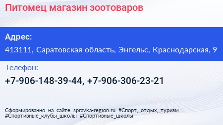 Питомец, магазин зоотоваров по адресу 413111, Саратовская область, Энгельс, Краснодарская, 9 в дальнейшем Организация, размещена в следующих категориях: