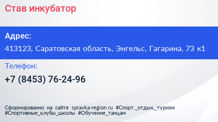 Став, инкубатор по адресу 413123, Саратовская область, Энгельс, Гагарина, 73 к1 в дальнейшем Организация, размещена в следующих категориях: