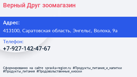 Верный Друг, зоомагазин по адресу 413100, Саратовская область, Энгельс, Волоха, 9а в дальнейшем Организация, размещена в следующих категориях: