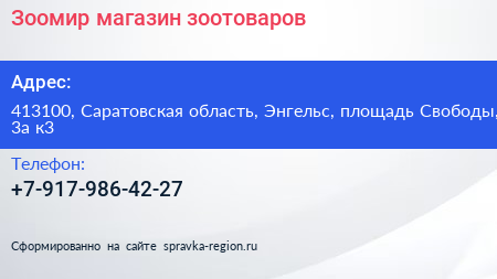 Зоомир, магазин зоотоваров по адресу 413100, Саратовская область, Энгельс, площадь Свободы, 3а к3 в дальнейшем Организация, размещена в следующих категориях: