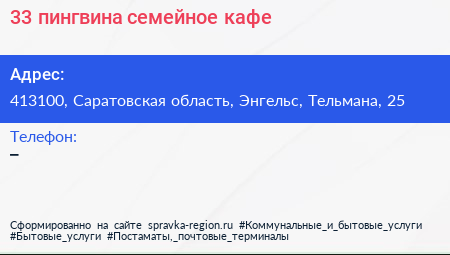33 пингвина, семейное кафе по адресу 413100, Саратовская область, Энгельс, Тельмана, 25 в дальнейшем Организация, размещена в следующих категориях: