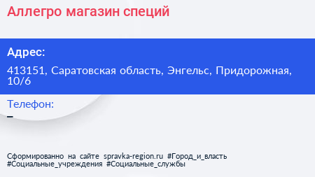 Аллегро, магазин специй по адресу 413151, Саратовская область, Энгельс, Придорожная, 10/6 в дальнейшем Организация, размещена в следующих категориях:
