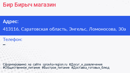 Бир Бирыч, магазин по адресу 413116, Саратовская область, Энгельс, Ломоносова, 30а в дальнейшем Организация, размещена в следующих категориях: