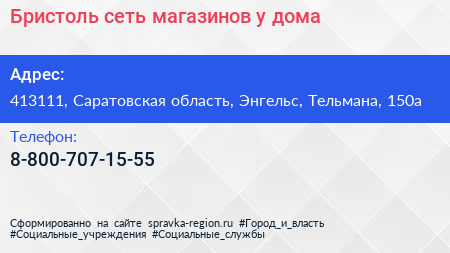 Бристоль, сеть магазинов у дома по адресу 413111, Саратовская область, Энгельс, Тельмана, 150а в дальнейшем Организация, размещена в следующих категориях: