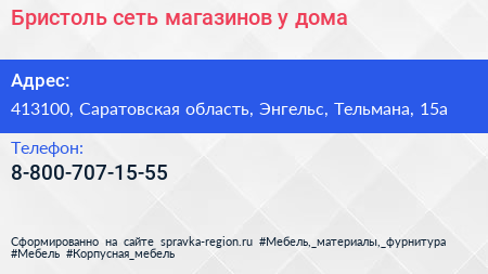 Бристоль, сеть магазинов у дома по адресу 413100, Саратовская область, Энгельс, Тельмана, 15а в дальнейшем Организация, размещена в следующих категориях: