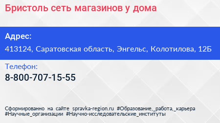 Бристоль, сеть магазинов у дома по адресу 413124, Саратовская область, Энгельс, Колотилова, 12Б в дальнейшем Организация, размещена в следующих категориях: