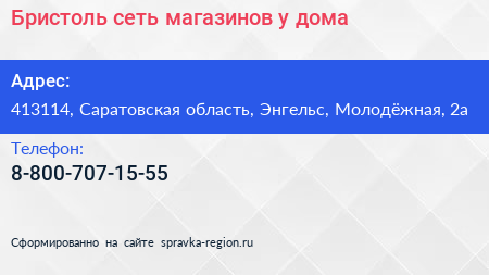 Бристоль, сеть магазинов у дома по адресу 413114, Саратовская область, Энгельс, Молодёжная, 2а в дальнейшем Организация, размещена в следующих категориях: