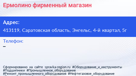 Ермолино, фирменный магазин по адресу 413119, Саратовская область, Энгельс, 4-й квартал, 5г в дальнейшем Организация, размещена в следующих категориях: