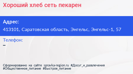 Хороший хлеб, сеть пекарен по адресу 413101, Саратовская область, Энгельс, Энгельс-1, 57 в дальнейшем Организация, размещена в следующих категориях: