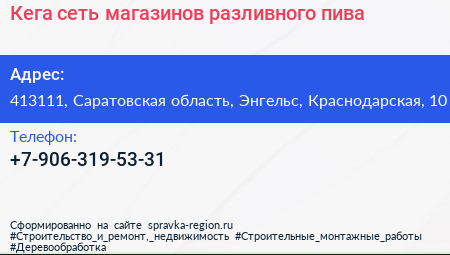 Кега, сеть магазинов разливного пива по адресу 413111, Саратовская область, Энгельс, Краснодарская, 10 в дальнейшем Организация, размещена в следующих категориях: