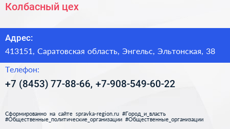 Колбасный цех по адресу 413151, Саратовская область, Энгельс, Эльтонская, 38 в дальнейшем Организация, размещена в следующих категориях: