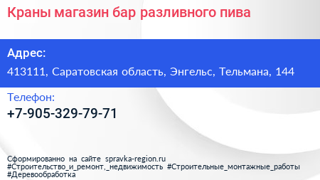 Краны, магазин-бар разливного пива по адресу 413111, Саратовская область, Энгельс, Тельмана, 144 в дальнейшем Организация, размещена в следующих категориях: