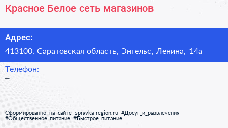 Красное & Белое, сеть магазинов по адресу 413100, Саратовская область, Энгельс, Ленина, 14а в дальнейшем Организация, размещена в следующих категориях: