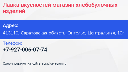 Лавка вкусностей, магазин хлебобулочных изделий по адресу 413110, Саратовская область, Энгельс, Центральная, 10г в дальнейшем Организация, размещена в следующих категориях: