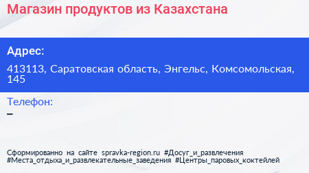Магазин продуктов из Казахстана по адресу 413113, Саратовская область, Энгельс, Комсомольская, 145 в дальнейшем Организация, размещена в следующих категориях: