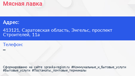 Мясная лавка по адресу 413121, Саратовская область, Энгельс, проспект Строителей, 11а в дальнейшем Организация, размещена в следующих категориях: