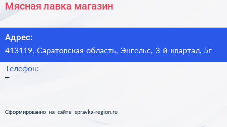 Мясная лавка, магазин по адресу 413119, Саратовская область, Энгельс, 3-й квартал, 5г в дальнейшем Организация, размещена в следующих категориях: