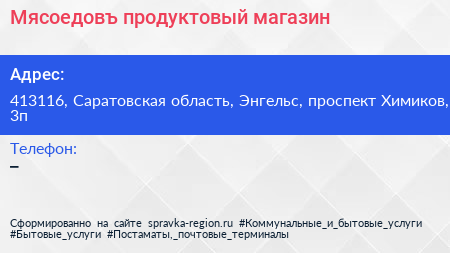 Мясоедовъ, продуктовый магазин по адресу 413116, Саратовская область, Энгельс, проспект Химиков, 3п в дальнейшем Организация, размещена в следующих категориях: