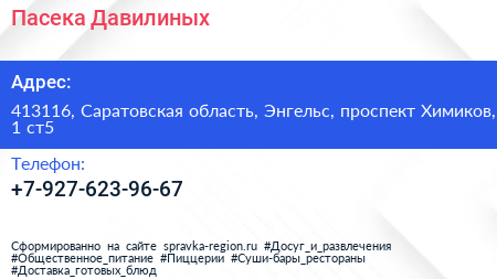 Пасека Давилиных по адресу 413116, Саратовская область, Энгельс, проспект Химиков, 1 ст5 в дальнейшем Организация, размещена в следующих категориях: